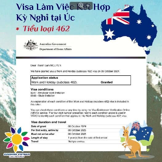 Ngày 08/10/2024, Sunshine Vietnam xin chúc mừng em Nguyễn Thanh Lâm (sinh năm 1999 tại Nghệ An) đã được cấp Visa lao động kết hợp kỳ nghỉ lần đầu tiên của Úc.