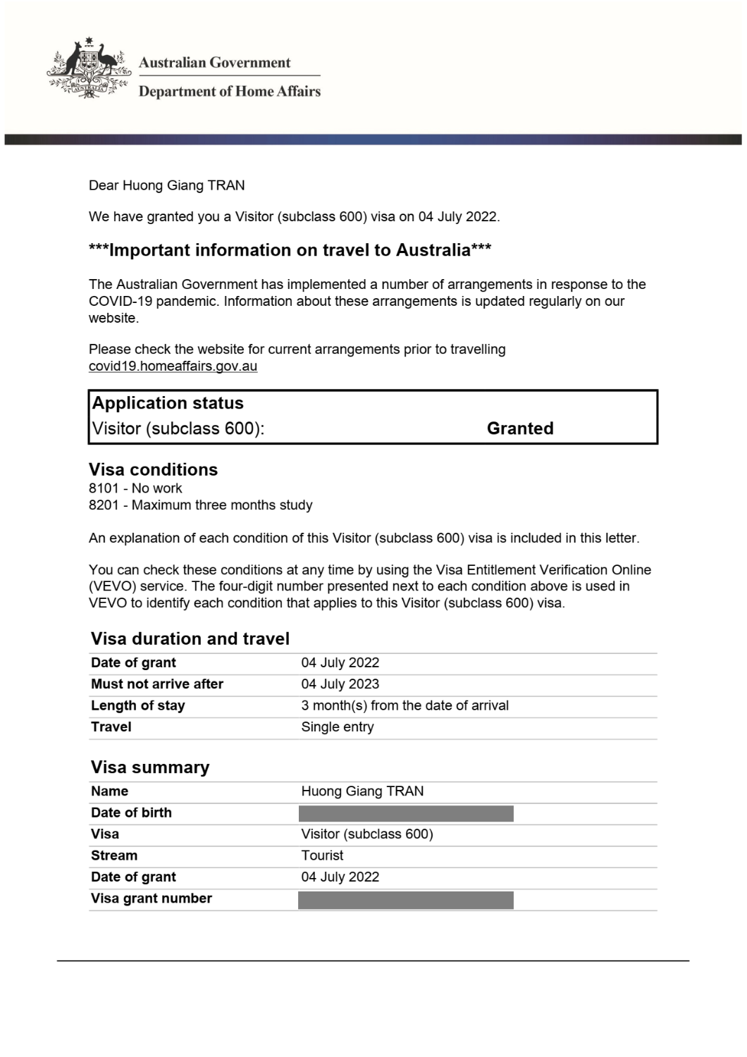 Với sự tư vấn và hỗ trợ nhiệt tình, chuyên nghiệp và tận tâm của Sunshine Vietnam, Hương Giang đã may mắn được cấp Visa du học hè Úc đúng ngay trước ngày khởi hành cùng đoàn. Đây quả là một điều cô cùng may mắn dành cho em khi Hương Giang mới chỉ xin Visa Úc lần đầu tiên.