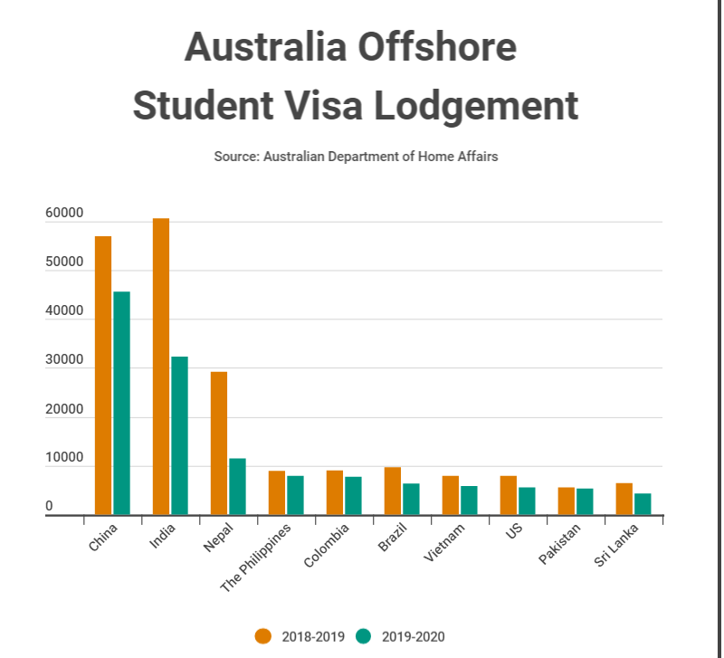Trong số các quốc gia hàng đầu về số lượng du học sinh tới Úc, đơn xin Visa từ Nepal giảm 60,7%, Ấn Độ giảm 46,7% và Trung Quốc giảm 19,9%.